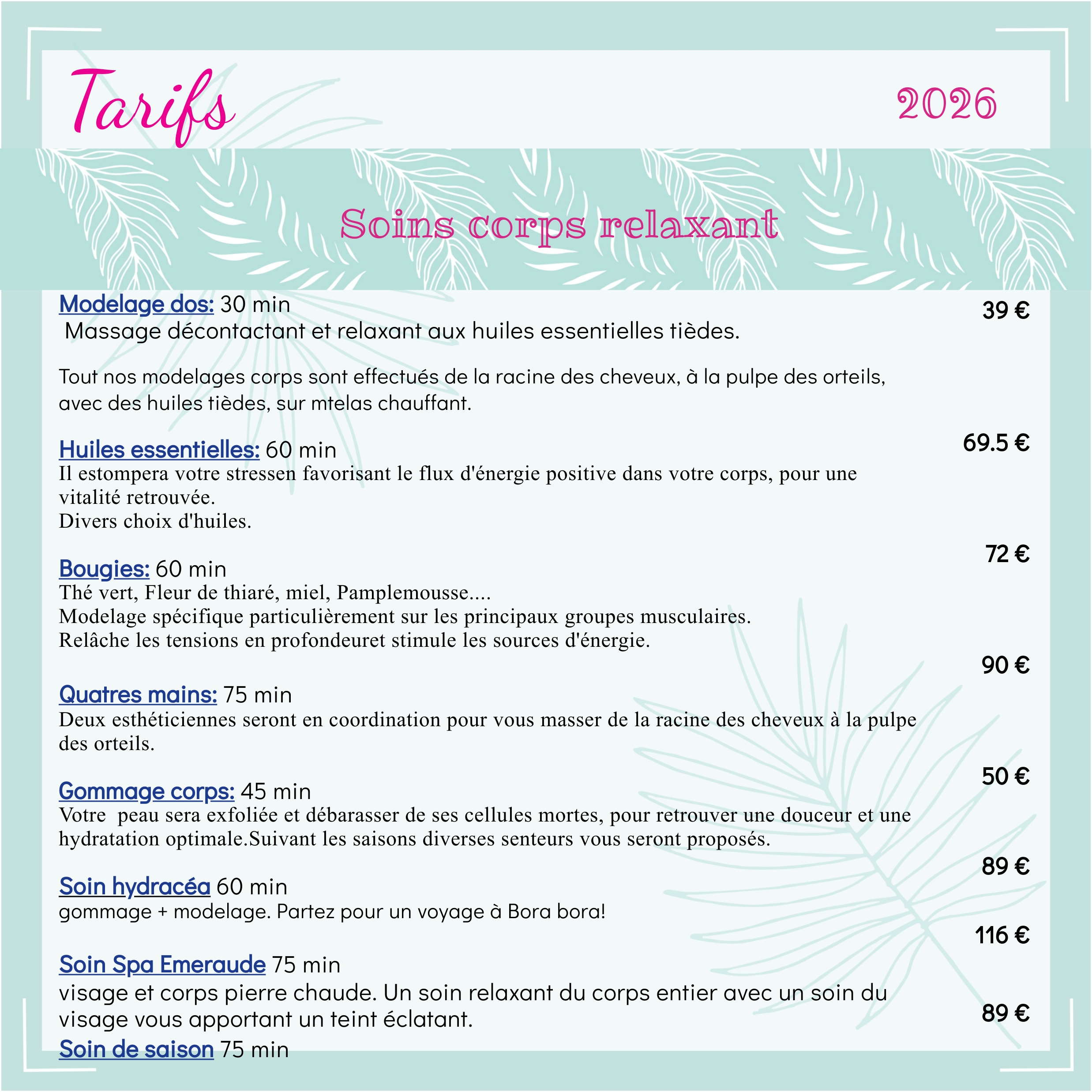 Nos soins vous permettront d’hydrater et de rendre votre peau douce et de vous relaxer de la racine des cheveux à la pulpe des orteils ! Chaque soin vous apportera des bienfaits différents. Lors de votre passage chez nous, après un soin corps, nous vous offrons une parenthèse de détente avec nos thés, cafés, boissons du moment, gourmandise dans notre espace privé détente.